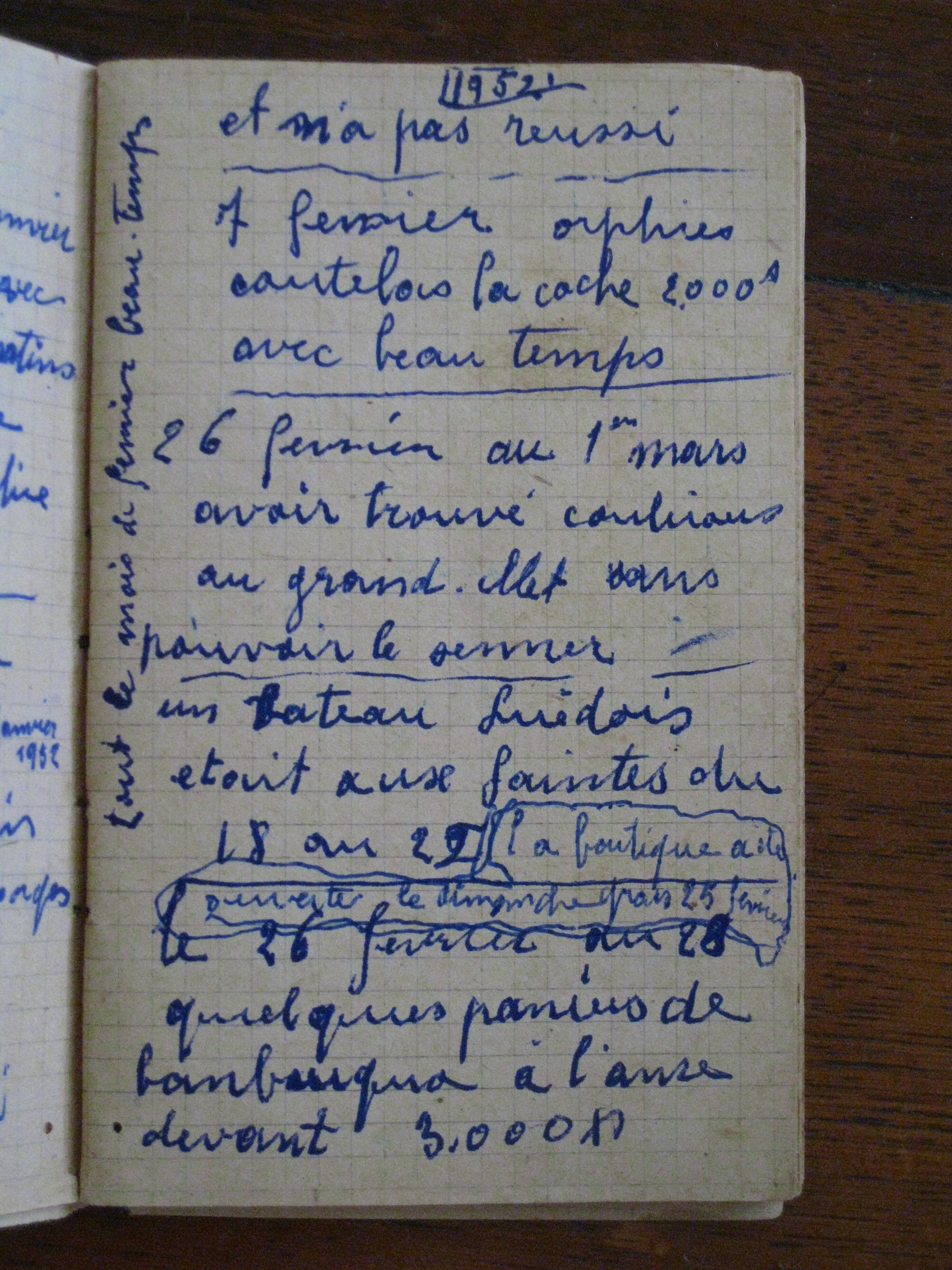 Les notes qui suivent, écrites au jour le jour de 1951 à 1955, relatent avec force détails, les actions de pêche à la senne, avec mention des dates, des lieux, des espèces et quantités de poissons pêchés, des conditions météorologiques rencontrées, des hommes ayant participé aux prises et des gains obtenus. Elles sont extraites d’un carnet de senne ayant appartenu à Joubert Césaire Joyeux, (1913-1975), marin pêcheur saintois, maître-senneur et charpentier de marine.