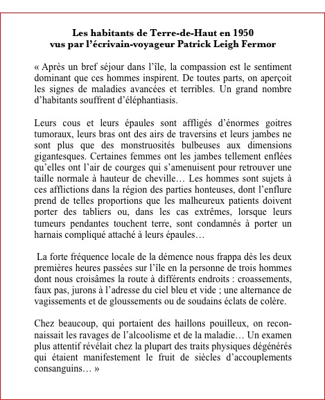 Mises à part ces dernières suggestions qui restent à réaliser et qui sont à nos yeux d’importance, nous sommes en définitive, aujourd’hui, concernant l’état sanitaire de la population saintoise et les équipements médicaux, bien loin, heureusement, des observations apocalyptiques, (qualifiées à juste titre par Jean-Luc Bonniol de hautement fantaisistes) (5), observations grotesques, à la limite du comique s’il ne s’agissait pas d’êtres humains, faites par l’écrivain-voyageur britannique Patrick Leigh Fermor (6), qui dresse dans son livre Vents alizés, paru en 1950, le terrifiant tableau ci-dessous, que je vous laisse néanmoins le soin d’apprécier avec toute la distance nécessaire :