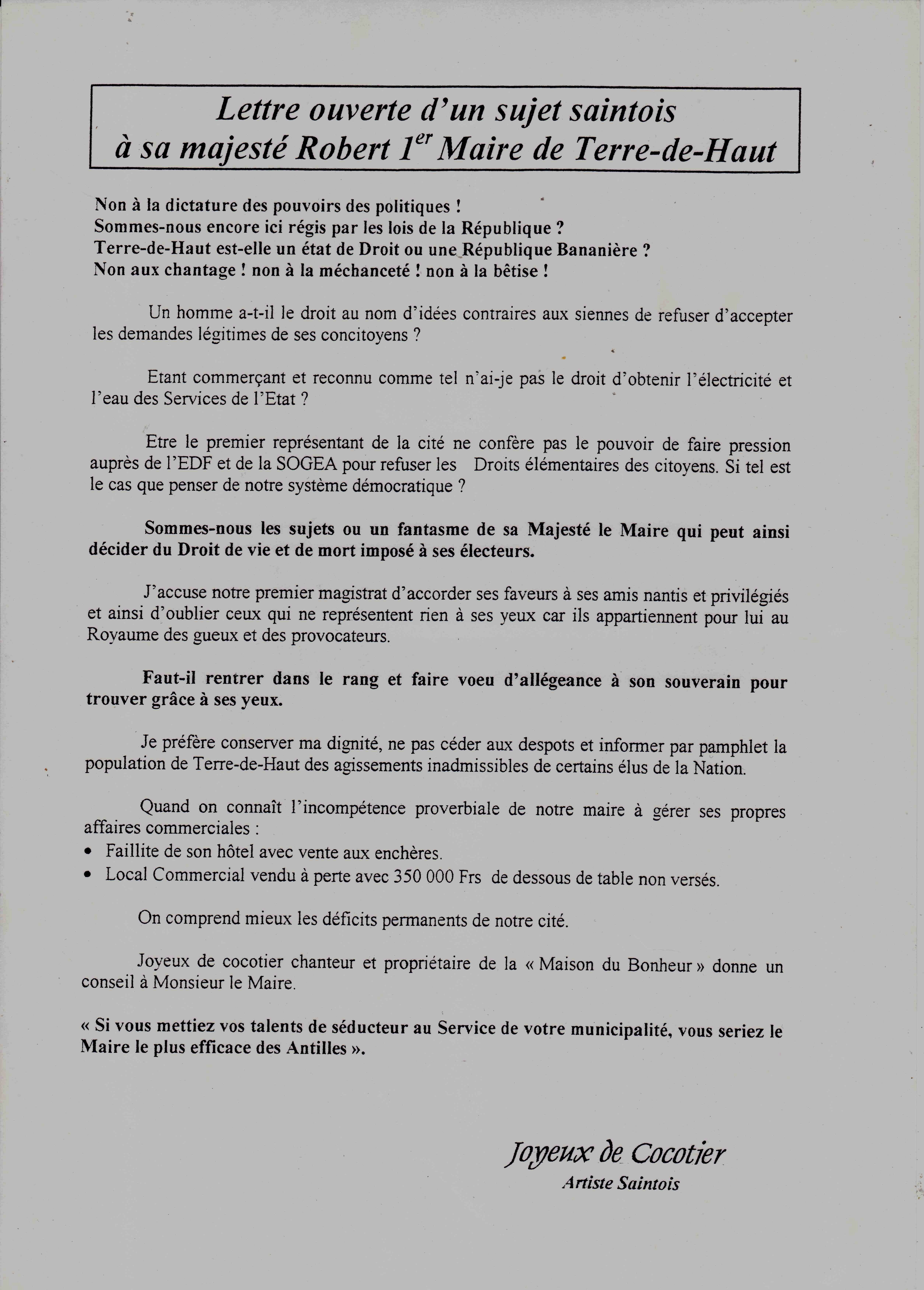 Déjà en conflit avec ce maire qu’il accuse de l’avoir illégalement dépossédé de sa filiation maternelle, pour une sombre et trouble affaire d’héritage, il entre en guerre ouverte avec le représentant de l’autorité municipale et publie contre lui des tracts et des tags vengeurs qui en disent long, s’il en était besoin, sur son tempérament naturel de provocateur sans complexe et d’anarchiste engagé. Cet épisode politico-familial ne l’empê-chera pas de continuer à aimer la poésie et la scène, et de se produire dans diverses manifestations aussi bien aux Saintes qu’en Guadeloupe. Ayant élu domicile à Sainte-Anne, en Grande-Terre, il anime en soirée les restaurants de la place, secondé  par sa compagne du moment, Princesse Christine, promue conseillère artistique et commerciale. Laquelle, grande fumeuse, souffrant en silence d’une affection maligne de la gorge, décédera prématurément, le laissant sincèrement meurtri et désemparé. Très affecté par le décès de sa Princesse, Cocotier quitte alors la Guadeloupe et les Saintes pour ne plus y revenir qu’épisodiquement.