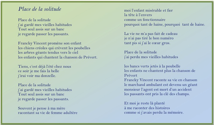 Rémon 2 rognéeRédacteur de cette chronique sur la poésie – comme de la plupart des précédents dossiers sur ce site – , j’ai choisi de m’intégrer à cette modeste anthologie, car ne pas le faire eût paru, me semble-t-il, me mettre à l’éRemon solsticecart, et pour certains, qui connaissent mes écrits, ce serait, à leurs yeux, me situer au-dessus du lot. Ce qui ne correspond, bien évidemment, ni à mes intentions ni surtout à la réalité. Mais comme il est difficile de parler de soi sur son propre blog sans paraître prétentieux, je vous renvoie, chers lecteurs, au menu de ce site à la rubrique biographie, vous aurez ainsi toutes (?) les informations me concernant. Un simple mot pour dire que depuis mon adolescence je suis un passionné de poésie et que j’ai commis quelques ouvrages dont beaucoup de mes compatriotes, aux Saintes et au-delà, connaissent au moins l’existence.La fraicheur