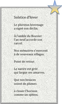 Voilà, chers lecteurs, pour vous remercier de votre fidélité et terminer l’année 2013 sur une note poétique, ces quelques textes qui, je l’espère, vous auront plu. Il me reste à remercier également nos amis poètes pour leur contribution et leur talent, aussi divers qu’original, persuadé que la communauté saintoise, Terre-de-Haut et Terre-de-Bas réunies, possède en son sein d’autres auteurs qui ne demandent qu’à se faire connaître. S’ils le désirent, ce site leur est ouvert. Je vous souhaite un JOYEUX NOËL, de bonnes fêtes de fin d’année et vous donne rendez-vous en janvier 2014 pour de nouvelles chroniques.