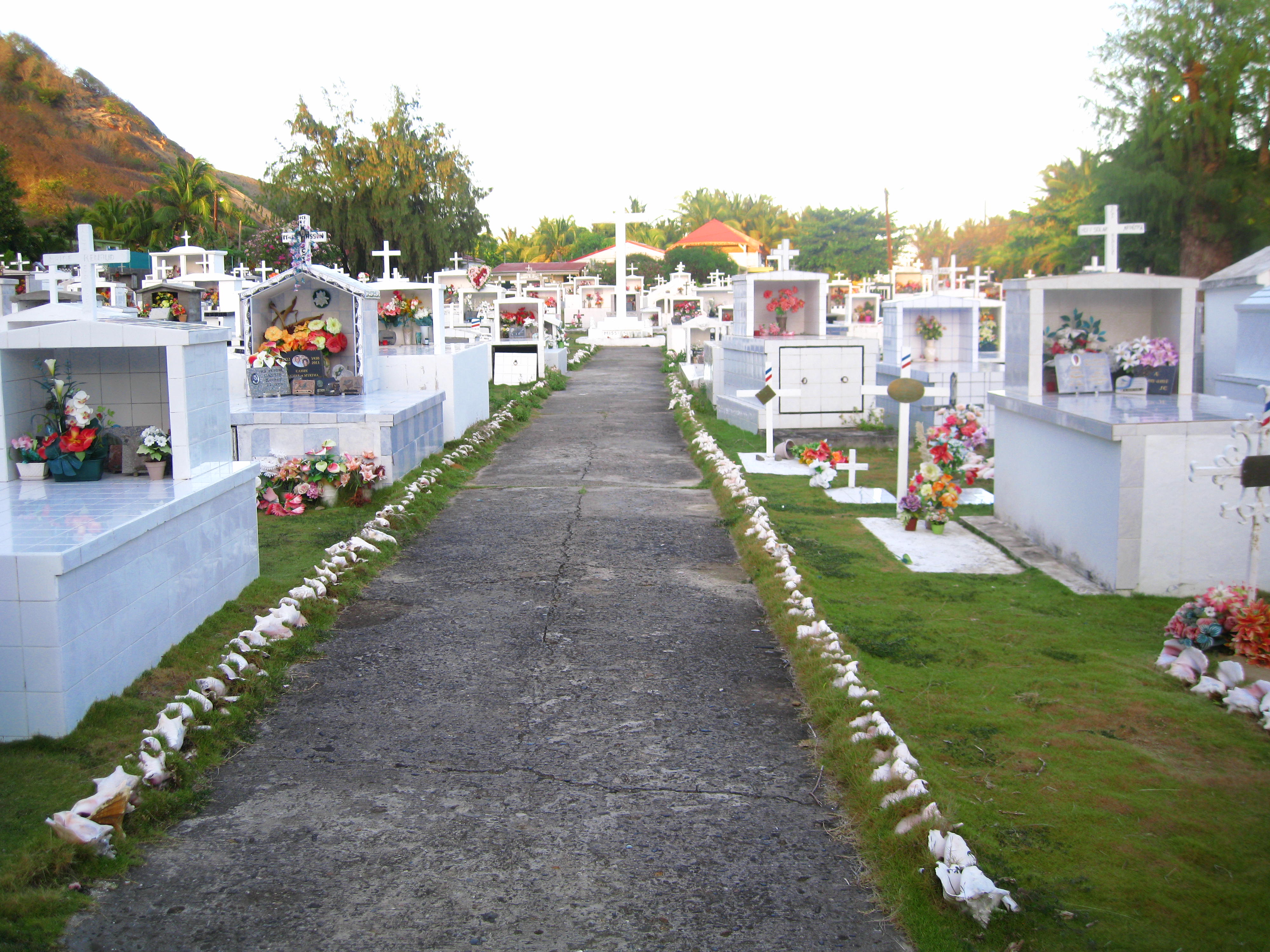 Les mausolées sophistiqués qui rendent les cimetières des Caraïbes tellement extravagants et bizarres laissaient ici la place à une forêt de croix de bois mangées par les vers qui penchaient de tous côtés au milieu des herbes hautes. Les intempéries avaient à demi effacé les noms et les tombes elles-mêmes étaient bordées, sinon même entièrement recouvertes, de ces belles conques qui parsèment toutes les côtes antillaises, plantées en terre du côté le plus large, le cône pointé vers le ciel.