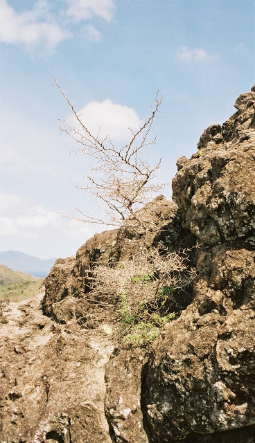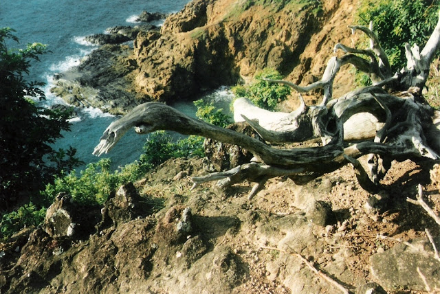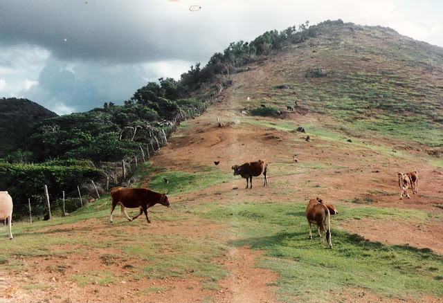 « Sous l’ardeur du soleil éclatant, les mornes ont pris des teintes rousses. Beaucoup d’arbres dépouillés de leurs feuilles n’étendent plus vers le ciel que des branches dénudées. Des jours et des jours ont passé sans que la moindre goutte de pluie soit venue rafraîchir la terre. Les citernes s’épuisent peu à peu et la population, sous ses grands chapeaux, s’inquiète, sans grand émoi cependant, de ce problème de l’eau, toujours inquiétant, jamais résolu. Des nuages s’amoncellent, vont frôler distraitement le Chameau et déversent sur la Terre-d’en-Bas leur ondée bienfaisante. Les moutons bêlent plaintivement ; les vaches ayant brouté l’herbe sèche, regardent au loin tristement et tous les feux du jour s’épanouissent glorieusement sous le ciel lumineux.