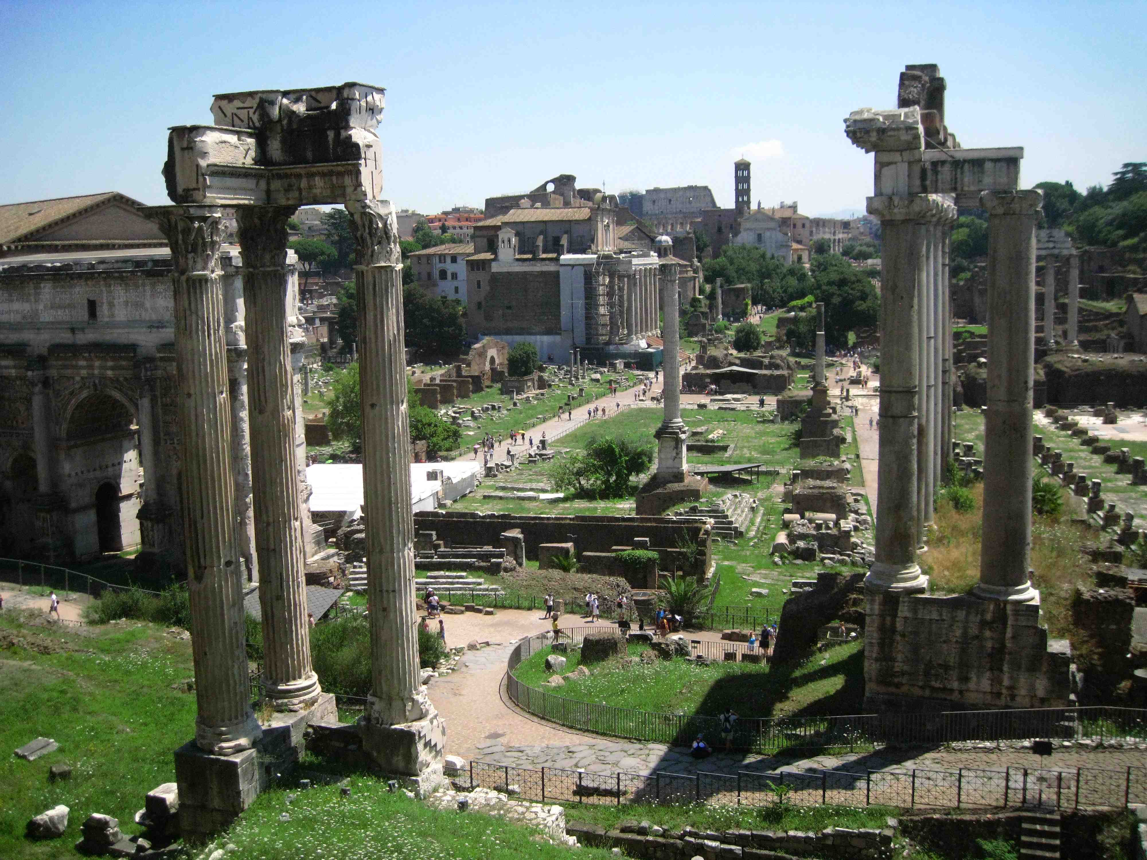 Des Musées Capitolins, on aperçoit les vestiges du Forum Républicain, lieu central et historique de la ville antique où les habitants et dirigeants, toutes classes confondues : simples citoyens, commer-çants, hommes politiques ou religieux, marchands ordi-naires ou vendeurs d’esclaves, se rencontraient et venaient discuter, acheter et vendre, tissant ainsi les liens sociaux indispensables à la vie harmonieuse de la cité. Situé entre le Capitole et Palatin, le Forum était l’endroit où se célébraient toutes les manifestations publiques et privées : mariages, jeux et combats de gladiateurs, cérémonies religieuses, échanges, décisions de justice, organisation administrative, économique, religieuse et politique de la ville… C’est aussi là que défilaient les troupes victorieuses revenues des campagnes militaires.