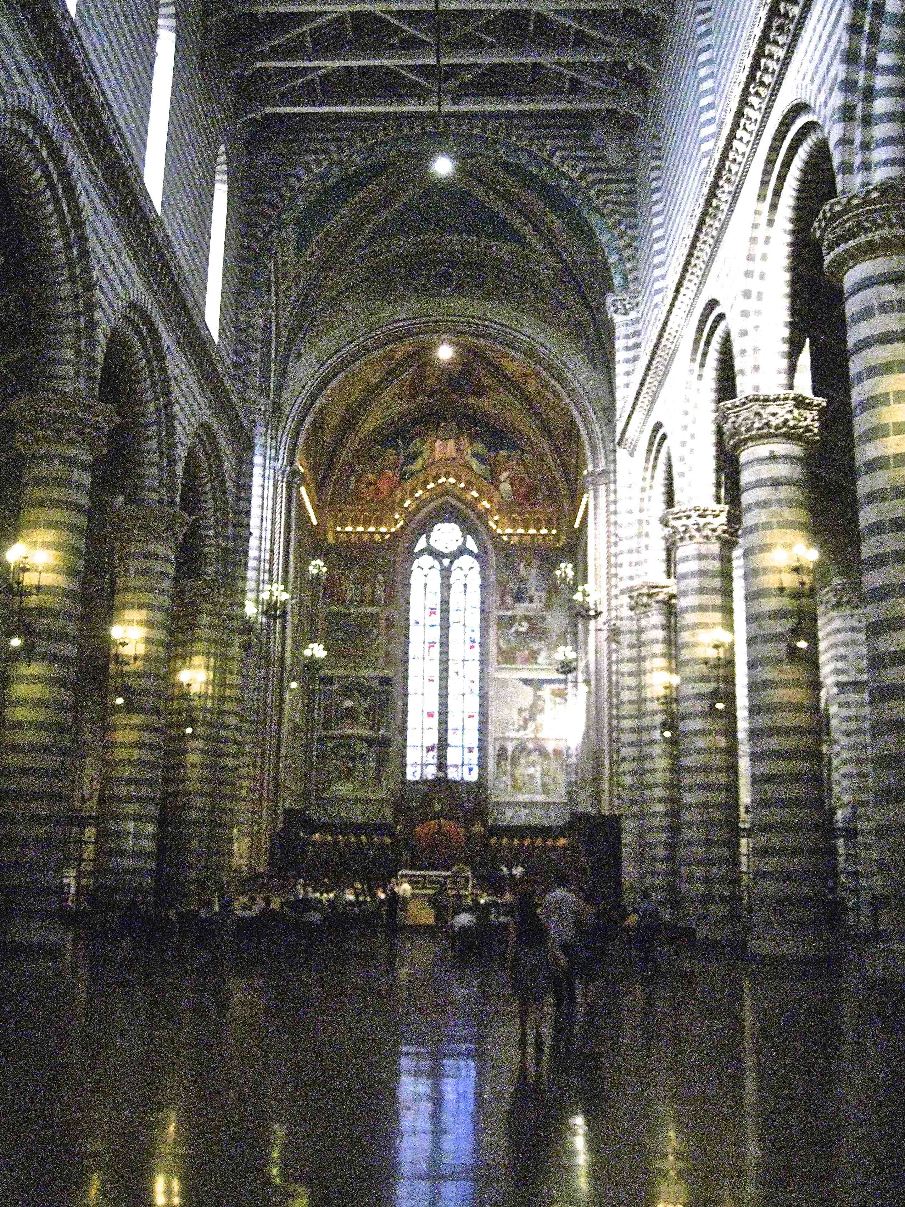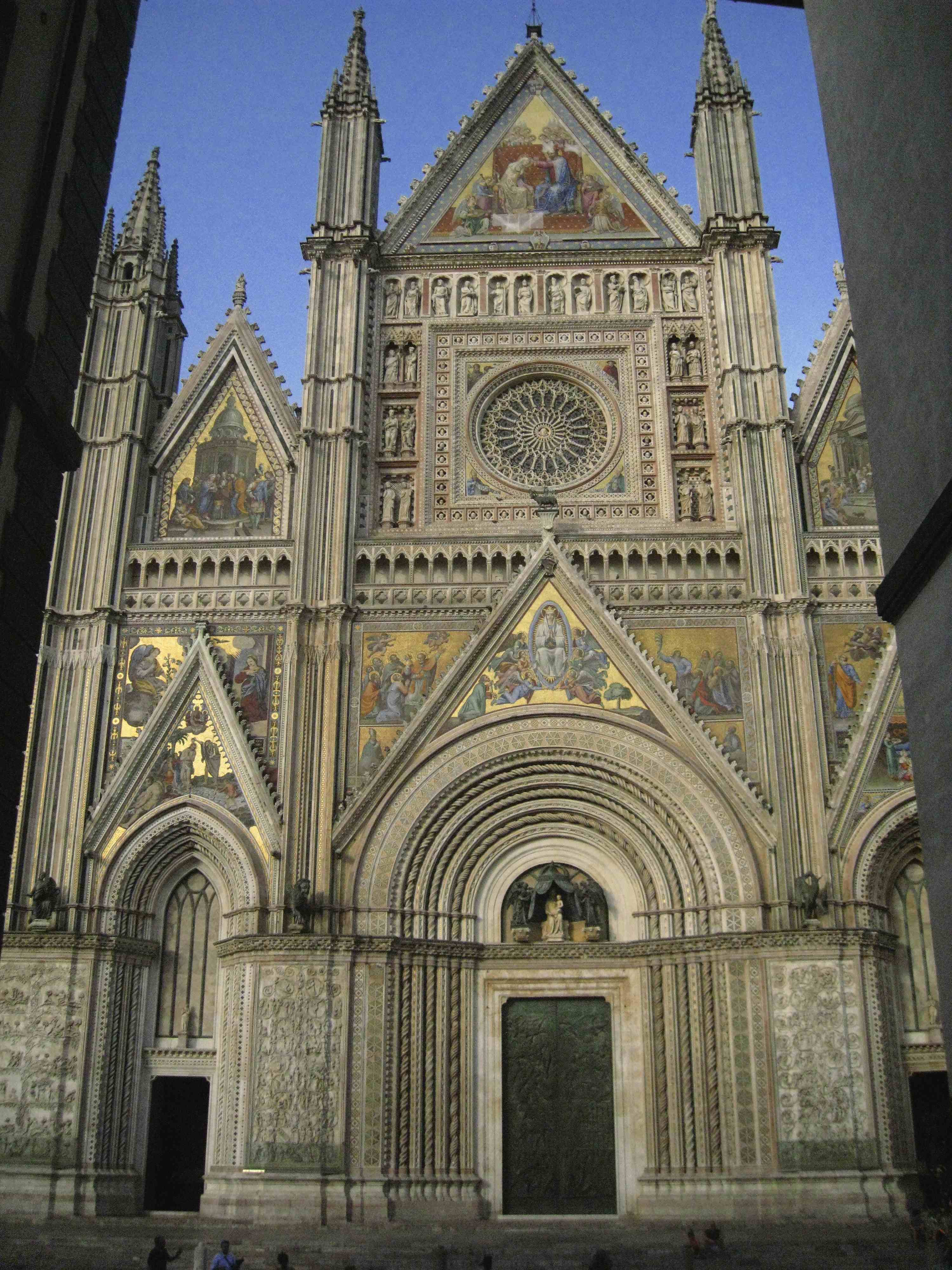 Édifiée à 325 mètres d’altitude, la petite ville d’Orvieto domine une vallée où coulent deux rivières qui se jettent l’une et l’autre dans le Tibre, le célèbre fleuve qui traverse Rome et sa région. Fondée vers 800 av. J.C. par les Étrusques, elle doit son nom à l’expression latine Urbs vetus qui signifie vieille ville. Pendant longtemps libre et indépendante, son influence fut grande au XIVè siècle où elle rivalisait avec Sienne. Orvieto doit une partie de sa célébrité à sa cathédrale, le Duomo di Orvieto, de style gothique dont la construction s’échelonna sur près de 2 siècles, entre 1290 et 1456. Dédiée à l’Assomption de la Vierge Marie, elle a un point commun avec la petite église de Terre-de-Haut, elle même consacrée à la Vierge. Mais rassurez-vous, c’est seulement cette consécration commune qui rapproche les deux églises. Longue de 90 mètres, large de 33 et haute de 34, la Cathédrale d’Orvieto domine tous les autres édifices de la ville et il fut une époque où les papes avaient choisi cette ville isolée comme lieu de séjour lorsqu’ils quittaient Rome pour se reposer.