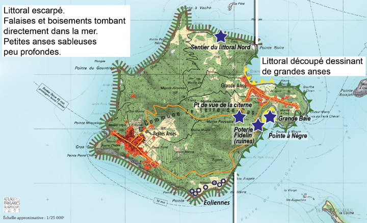 La superficie de Terre d’en Bas dépasse celle de Terre d’en Haut, car elle mesure 3000 mètres du Nord au Sud et 3000 mètres de l’Est à l’Ouest. Le bourg est bâti à 60 mètres environ au-dessus du niveau de la mer ; on y arrive par un chemin excessivement rapide qui naît de Petites Anses. Terre d’en Haut est distant de Terre d’en Bas de 4650 mètres (distance rectiligne mesurée de l’Anse du Bourg de l’une à la Grande Anse de l’autre); mais il faut compter un trajet triple lorsqu’on veut atterrir aux Petits Anses. Le vent et les courants sont tels que les marins eux-mêmes préfèrent à cette traversée celle du Vieux Fort, et depuis longtemps ils demandent que leur commune relève du Vieux Fort au lieu de Terre d’en Haut (perception, contribution, syndicat maritime, service de santé.) »