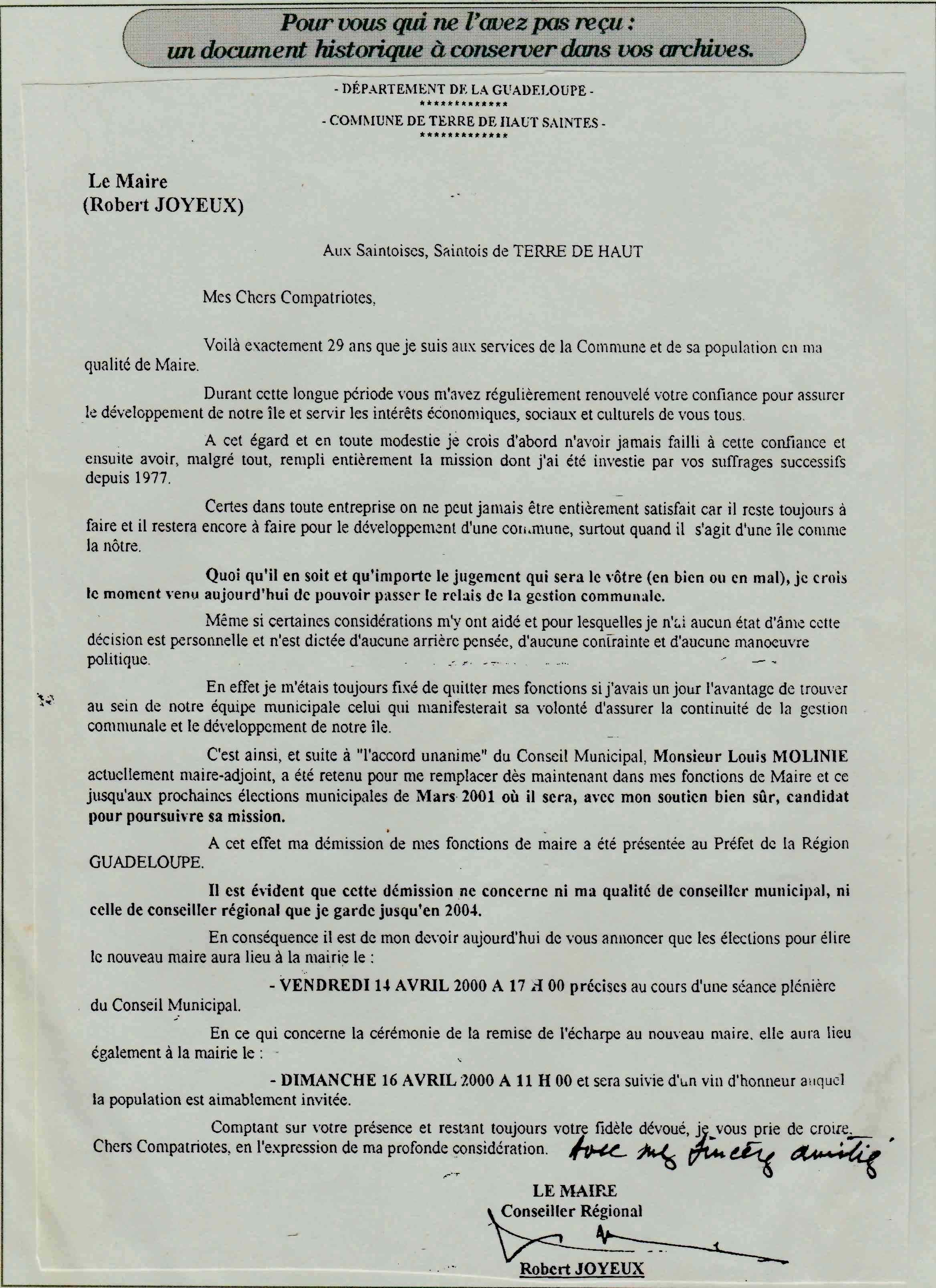 Dépenses inconsidérées qui aboutiront au premier grand déficit budgétaire, prélude à une seconde faillite intervenant quelques années plus tard avec son successeur. Sévèrement pointé du doigt par la Chambre Régionale des Comptes qui juge calamiteuse et passible de sanction sa gestion des deniers publics communaux, Robert Joyeux est contraint à la démission. C’est dans la lettre ci-dessous, non datée mais rendue publique en mars 2000, qu’il informe les Saintoises et les Saintois de sa décision, vraisemblablement imposée, selon ses détracteurs, par les autorités préfectorales pour lui éviter des ennuis judiciaires. Tout en précisant qu’il n’abandonne aucun de ses autres mandats, ceux de conseiller municipal et régional, tel un monarque de droit divin et anticipant le choix du conseil municipal, il désigne son dauphin en la personne de Louis Molinié. Lequel sera élu par ses pairs le 14 avril 2000 et reconduit dans ses fonctions l’année suivante, aux élections municipales de mars 2001, puis successivement en 2008 et 2014. Il reste à savoir si le successeur de Robert Joyeux fait mieux que lui en matière de pratique démocratique et de gestion budgétaire. Sur ce dernier point on peut déjà répondre que non puisque, pour mémoire, le déficit actuel de la commune de Terre-de-Haut, selon le dernier rapport de la Chambre Régionale des Compte, avoisine les six millions d’euros, soit trois fois supérieur en valeur constante, à celui des années 1990.