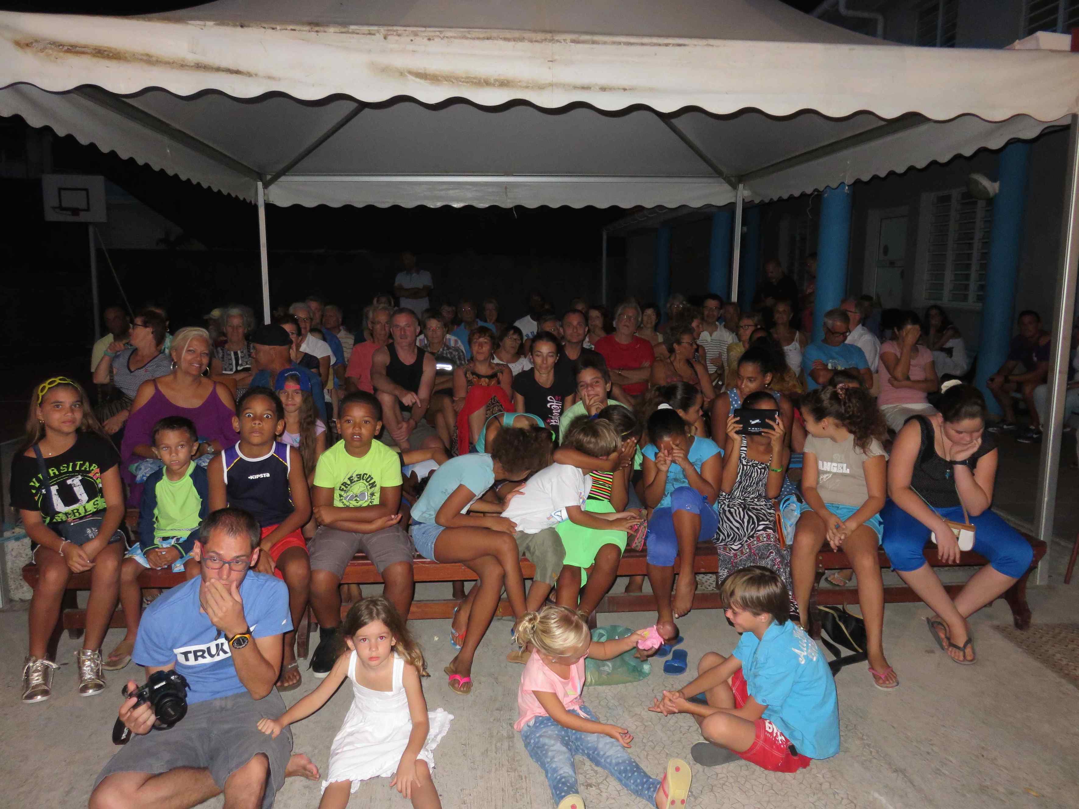 le publicDéjà, en juin 2014, pour clore plus de 6 mois de préparation, de répétitions et d’essais de mise en scène, c’est dans la grande salle de l’hôtel La Saintoise, prêtée par Jean-Claude Samson, que la petite troupe proposa à la population de Terre-de-Haut une parodie du fameux feuilleton télévisé, Amour Gloire et Beauté. L’expérience porta ses fruits puisqu’un an tout juste après ce coup d’essai réussi, toujours sous la conduite d’Annie Benomar, c’est une vraie pièce de théâtre que le public a pu découvrir et apprécier en ce début de mai 2015, cette fois-ci, à l’école primaire. Concernant cette dernière prestation, il faut imaginer le travail fourni par ces comédiens d’occasion, peu habitués à  mémoriser un texte relativement long, peu accoutumés à se donner la réplique sans bafouiller ni se tromper ; il faut imaginer l’assiduité et la persévérance qui furent les leurs depuis janvier ; la contrainte acceptée de se retrouver en répétition tous les mardis soir après le travail, pour mesurer leur mérite respectif et l’amour partagé du théâtre qui les anime… Assiduité, persévérance et amour du théâtre que nous devons saluer et qui furent récompensés par la présence d’un public attentif et enthousiaste, comme ce fut le cas les 7 et 8 mai derniers.