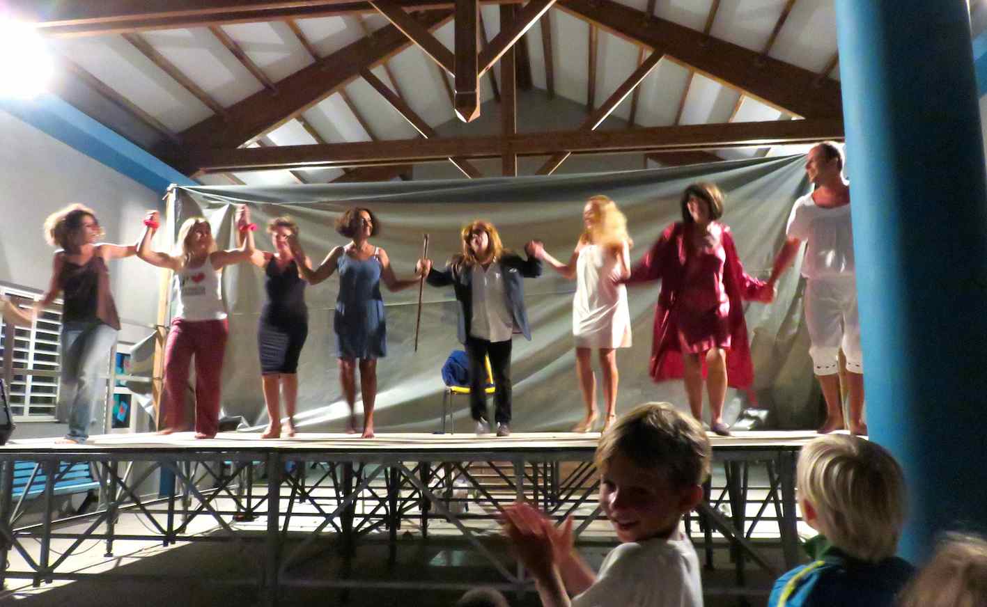 une scène 2Cela dit, ne boudons pas notre plaisir. Annie Benomar et ses comédiens d’un jour ne sont en rien responsables de la carence communale en matière de salle de spectacles même modeste, disposant d’une véritable scène et de tous les accessoires destinés à une représentation théâtrale digne de ce nom : rideaux, coulisses, costumes, décors, éclairages, sonorisation… Bien préparés à jouer avec le strict minimum, les comédiens d’Annie ont démontré avec bonheur leurs capacités à se passer de décorum. Et ce n’est pas le moindre de leur mérite. Souhaitons qu’ils ne s’arrêtent pas en si bon chemin et qu’à l’avenir, plus que jamais habités de l’esprit du beau spectacle en général et du théâtre en particulier, ils nous gratifient encore et encore de leurs talents, amorçant ainsi et perpétuant pour notre plaisir et celui de notre communauté (Terre-de-Bas comprise) une véritable vie artistique et culturelle qui manquait jusqu’alors cruellement aux Saintes… Avec l’espoir de faire chez nos jeunes et moins jeunes des émules motivés et persévérants. Encore bravo et merci à cette troupe d’amateurs bénévoles et à son metteur en scène qui ont su nous régaler l’espace de deux petites soirées, trop rares aux yeux de beaucoup de spectateurs – enfants et adultes – plus que ravis rencontrés à l’issue des représentations…