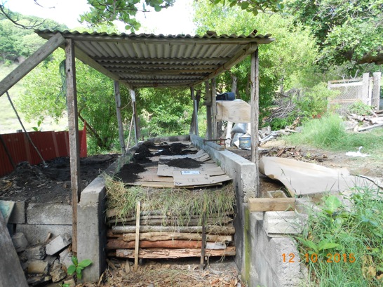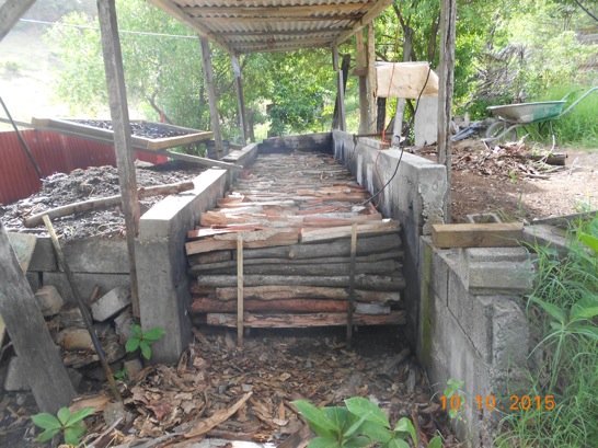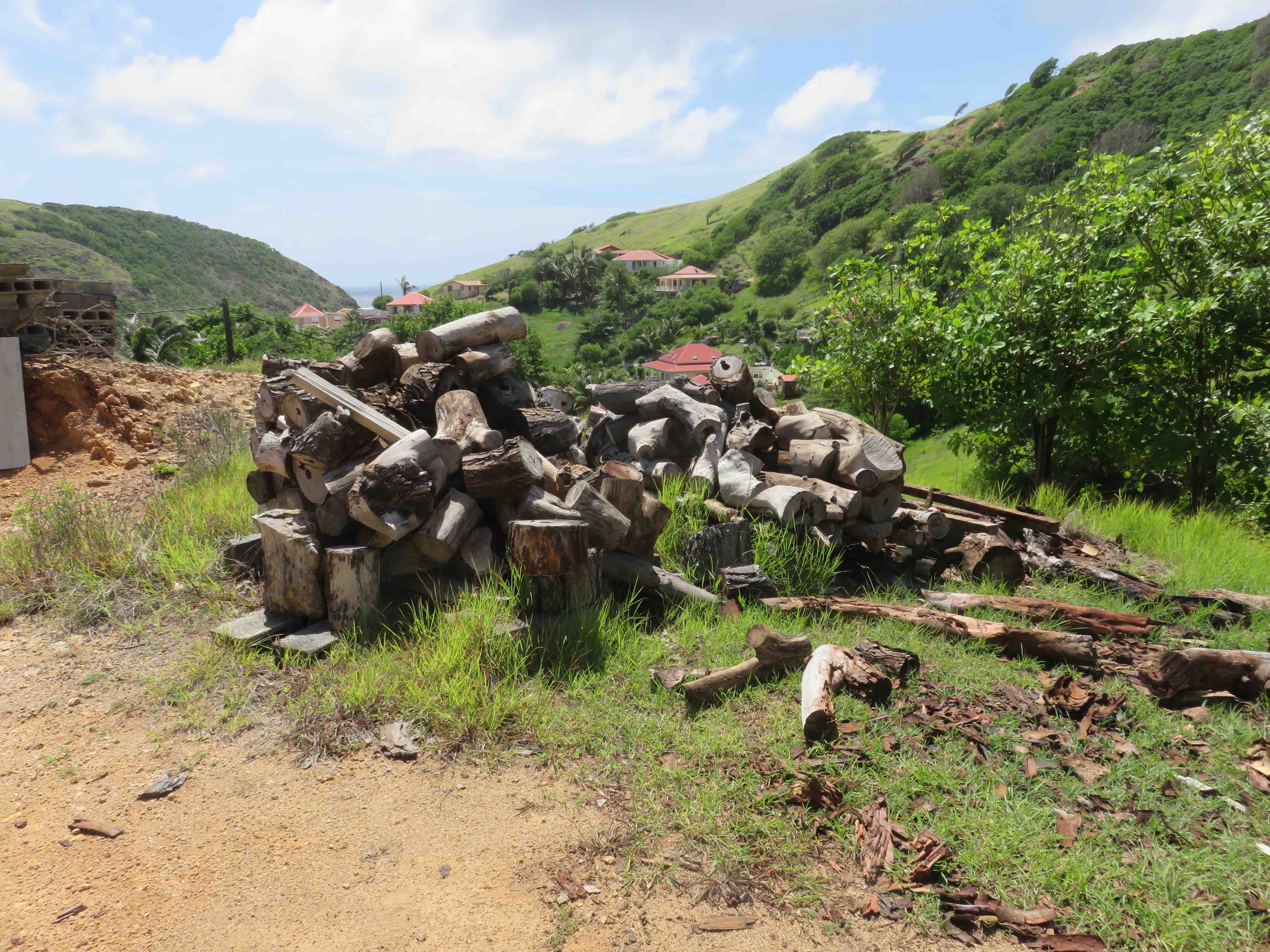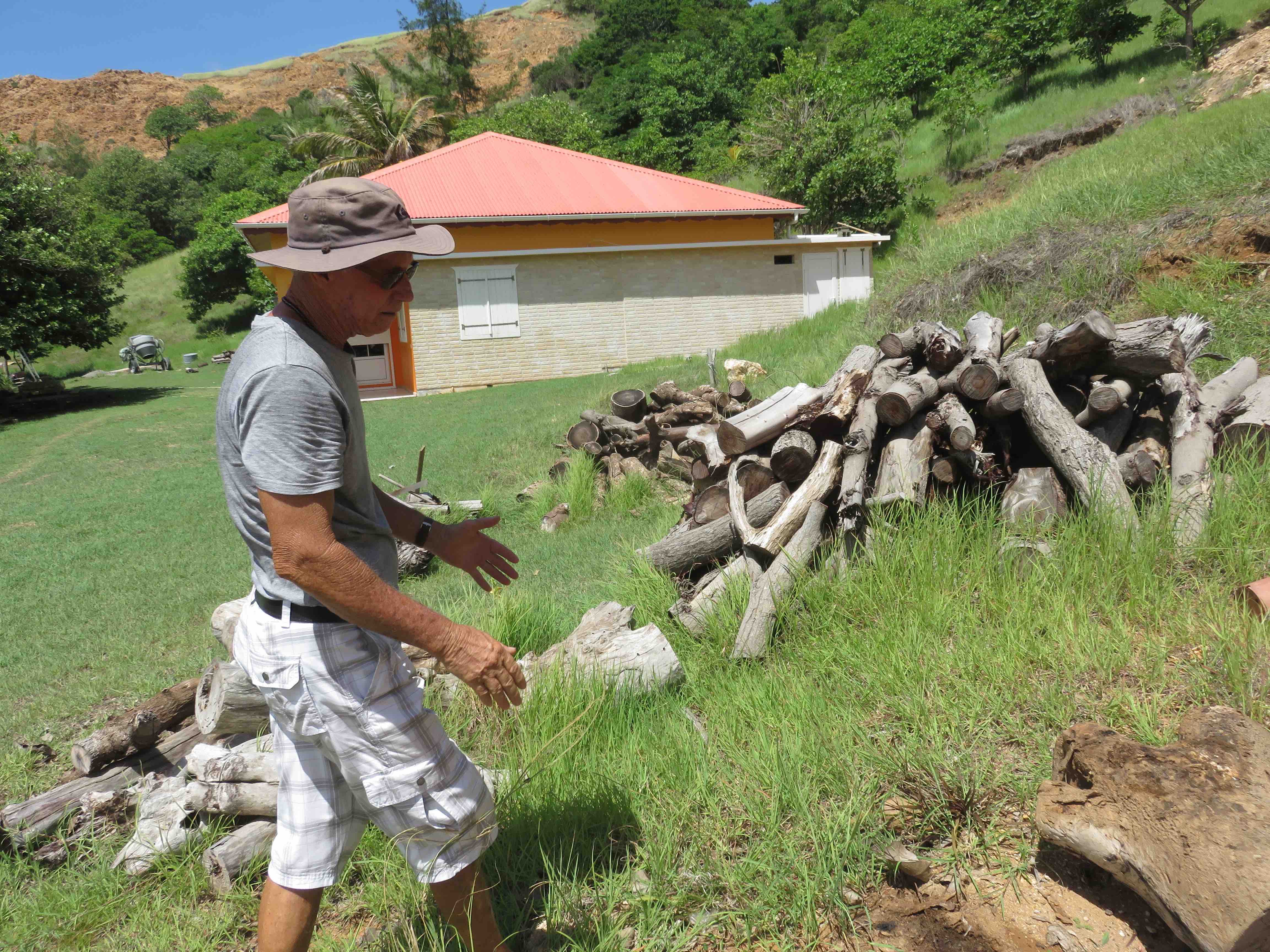 IMG_4407 - copieQui dit charbon de bois, dit bois, évidemment, vous l’aurez deviné. À raison de deux fournées seulement par an, Rodolphe doit néanmoins s’approvisionner régulièrement en matière première. Mais rassurez-vous. Fini le temps où il fallait courir les mornes armé de sa machette. En réalité ce n’est pas Rodolphe qui va au bois, c’est le bois, pourrait-on dire, qui vient à lui. Un ami, un particulier, s’apprête à élaguer ou à abattre un arbre, quel qu’il soit, notre charbonnier en est le premier informé. Il n’aura que les frais de transport jusqu’au pied de son domaine, à charge pour lui de le tronçonner (le bois, pas le domaine !) encore vert aux dimensions adéquates et de le laisser sécher le temps nécessaire, (autour de 6 mois), avant de le conditionner dans le four suivant une technique éprouvée, acquise au fil de l’expérience. Il convient en effet d’alterner gros et petits tronçons, en tenant compte de la noblesse de leur essence. Mahogany, raisinier de mer, quénettier, savonnette, tous, bois noble naturellement, n’auront pas le même traitement que le mancenillier, par exemple, bois traitre par excellence qui pourrait vous anéantir toute une fournée s’il est mal positionné dans l’agencement. De la qualité du bois et de sa place dépend la qualité de la combustion et du charbon. En plus d’être un art, c’est une évidence.