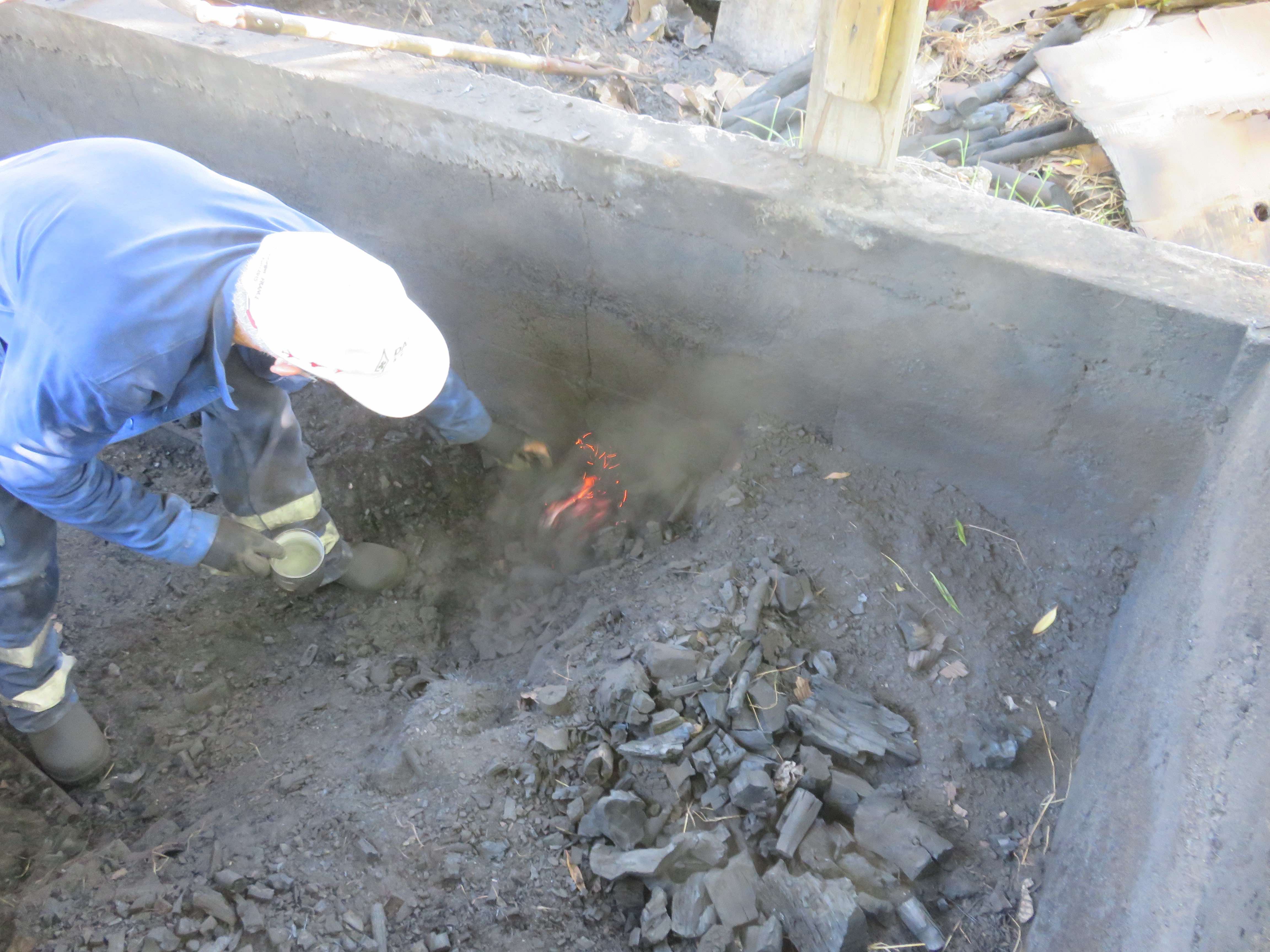 IMG_4493 - copieSi le travail de préparation du four est exigeant et méticuleux, celui du défournage n’est pas moins astreignant. Lorsqu’il se rend compte que la combustion est complète car toute la fournée s’est effondrée sur la totalité de sa longueur comme un soufflé qui s’est affaissé, le charbonnier peut procéder au défournage. Il enlève successivement les différentes couches de protection et s’active de ses outils à sortir le charbon de la fosse. Les morceaux mêlés à la terre sont tamisés, les autres, plus nombreux et de grosse taille sont étalés sur des tôles pour éviter toute reprise du feu au sol. Mais attention, une braise non repérée et qui continue d’être active sous l’effet de l’air, peut faire repartir spontanément la combustion et c’est tout le charbon encore au four ou déjà sorti, laissé sans surveillance, qui s’enflamme et part en cendre. C’est pour éviter ce danger que Rodolphe est attentif à tout filet de fumée suspecte, à la moindre odeur caractéristique de « brûlé ». Muni d’un seau d’eau, il prend soin d’éteindre toutes les braises repérées et les met de côté, car il a déjà perdu par le passé une fournée entière et ne souhaiterait pas connaître pareille mésaventure.