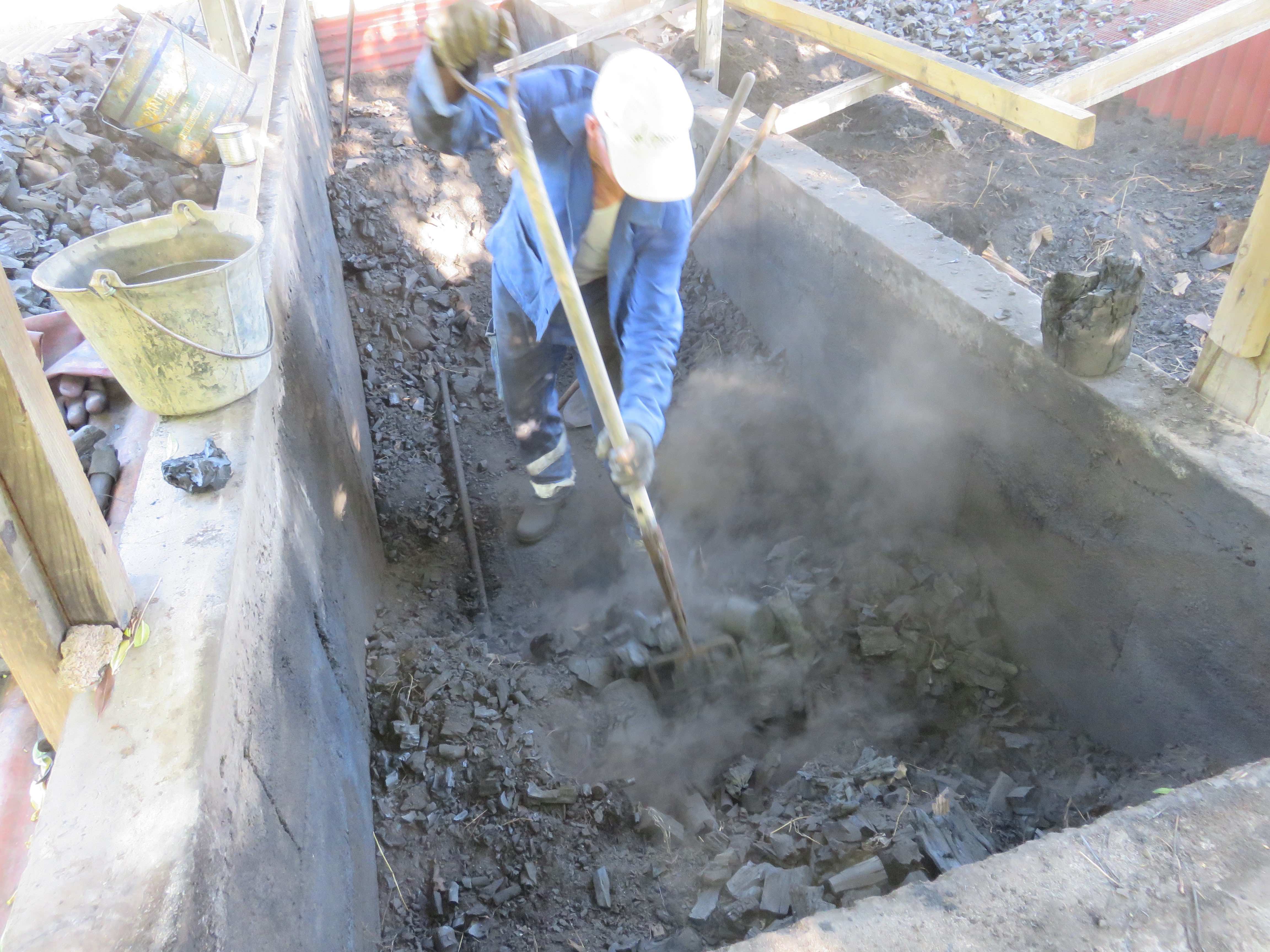 mimi 1Les producteurs de charbon de bois d’autrefois se contentaient de creuser le sol et d’y agencer leur bois, ménageant sur le sommet du four une cheminée centrale, ce qui ne les empêchait pas de faire du très bon charbon. Rodolphe a perfectionné le système en bétonnant le fond de sa fosse (6 mètres sur 1 mètre 25 et 0 m 80 de hauteur), la délimitant latéralement par un assemblage de quatre rangs de parpaings. L’ensemble est protégé par un petit toit de tôles soutenu par des madriers servant supports. La cheminée se trouve au sol, à l’opposée de l’entrée du four.