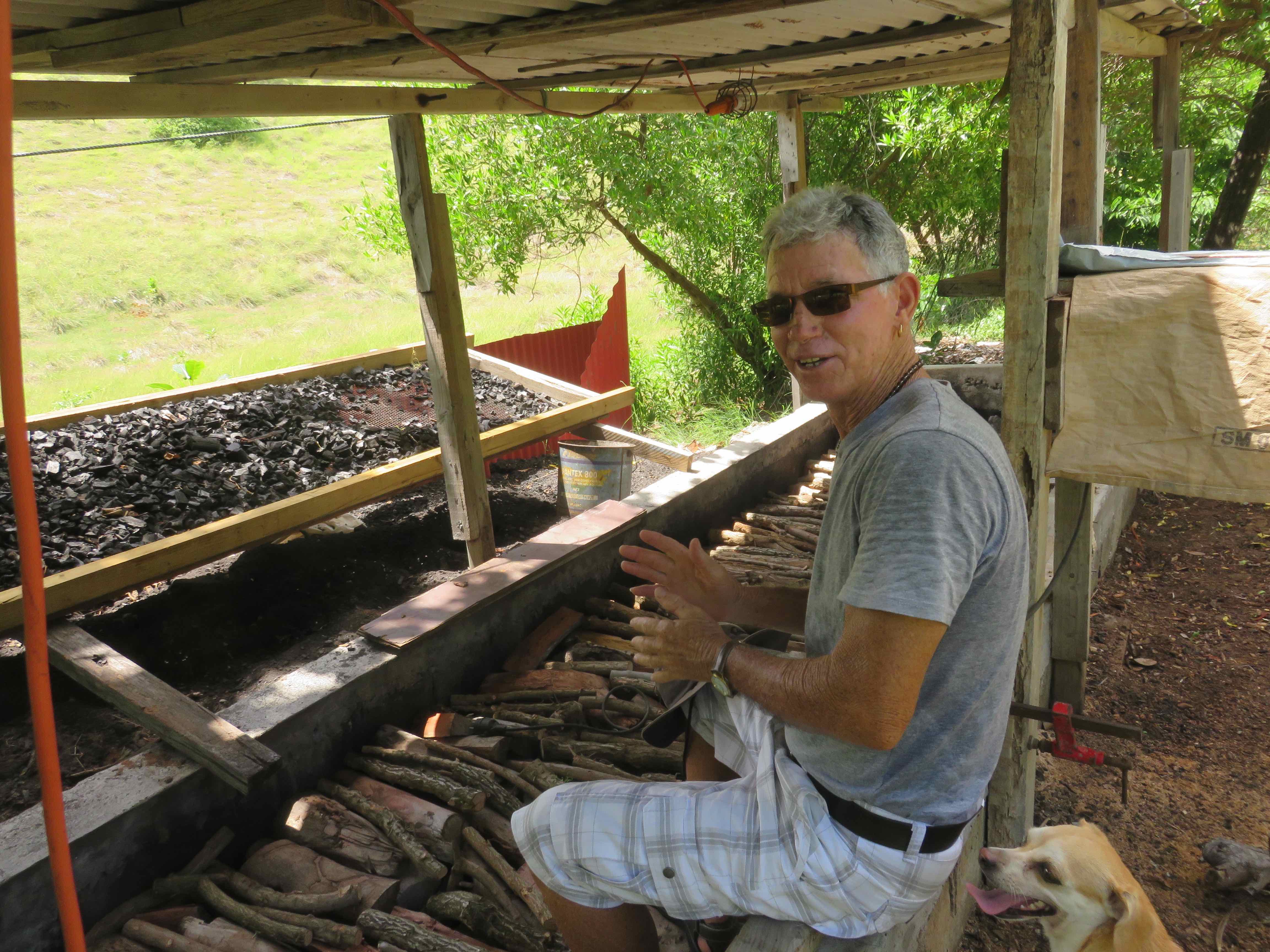 IMG_4500Rodolphe FOY est né à Terre-de-Haut en 1952. Titulaire d’un CAP de maçonnerie et de carrelage, obtenu lors d’un séjour en Métropole, il regagne les Saintes en 1994 pour y exercer son métier et bâtir sa maison sur les hauteurs dominant la plage mythique de Grande-Anse. Une vue imprenable sur le large et les rouleaux de l’Atlantique. Vue grandiose balayée par les alizés et qu’il faut mériter car le morne est bien haut qui mène à sa demeure. Très jeune, alors qu’il est écolier, son beau-père Julien, lui enseigne les rudiments de la fabrication du charbon de bois. (Petit clin d’œil en passant : vous aurez sans doute observé l’occurrence des deux prénoms, héros célèbres de la littérature française : Rodolphe l’amant de Mme Bovary ; Julien, l’amoureux de Mme de Rénal. Flaubert et Stendhal pour une fois réunis aux Saintes!) Bref, Rodolphe perfectionne au cours des ans les rudiments enseignés par Julien et devient à l’instar de son mentor un maître charbonnier incontesté…