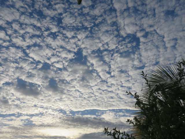 Un des signes de la présence du poisson au large est la concentration inhabituelle d’oiseaux de mer, appelés chez nous gibiers marins, survolant le ban (thon, bonites, carangues, colas, orphies…). Mais il existe aussi, semble-t-il, des signes météorologiques avant-coureurs inscrits dans le ciel, auxquels beaucoup croient encore, même si rien n’est scientifiquement prouvé en ce domaine. Ainsi deux jours avant la pêche miraculeuse de Basse-Terre le 27 mars 2017, le ciel est resté étrangement pommelé toute la journée, ce qui a fait dire à beaucoup de Saintois – comme le disaient autrefois les anciens – que c’était un « ciel à coulirous ». Or la chose s’est bel et bien produite pour la grande satisfaction des pêcheurs basse-terriens, comme on peut le voir dans le reportage de Guadeloupe 1ère. Alors, vérité, coïncidence ou superstition ? Voici la photo du ciel de Terre-de-Haut, deux jours avant la prise miraculeuse de Basse-Terre.