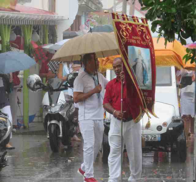 Malheureusement, la météo n’a que faire de la foi du charbonnier. Et c’est un déluge impressionnant que le ciel délirant déverse imperturbable sur les Saintes. Déluge et bourrasques réunis qui obligent tout le monde à trouver un abri au plus vite, malgré la protection dérisoire des parapluies que les rafales retournent, ballottent en tous sens et rendent inefficaces. Bien entendu, le cortège s’arrête au tiers de son parcours et, hélas, ne repartira plus. Pluie, vent, branches et feuilles qui s’envolent mettent fin à la procession à peine commencée. La foule, trempée, désemparée par le réveil brutal des éléments, attend courageuse l’éclaircie espérée, puis progressivement s’éparpille en silence… Et toutes les décorations, si amoureusement élaborées, soufflées en un instant par l’onde tropicale, finissent dans les rues, emportées par la bourrasque et l’eau ininterrompue qui n’en finit pas de tomber !.. Avec du travail supplémentaire en perspective pour nos sympathiques employés municipaux déjà si  généreusement sollicités !