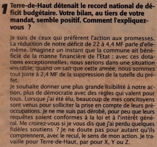 Lorsqu’un an tout juste après sa première élection à la tête de la commune, interrogé par un correspondant local du quotidien France-Antilles daté du 12 juin 2002, le maire actuel de Terre-de-Haut, s’étant un peu trop hâtivement félicité d’avoir réglé le problème du déficit, avait déclaré : « Je souhaite donner une plus grande lisibilité à notre action, plus de démocratie avec des règles qui valent pour tous… Je suis un homme de dialogue, soucieux d’équité et de solidarité… » 2, il aurait été bien inspiré de suivre lui-même ces règles et de mettre en pratique ces belles paroles. Mais le ver était déjà sans doute dans le fruit et nous savons, 15 ans plus tard, ce qu’il est advenu de ces déclarations qui n’étaient en réalité que du vent. Un vent qui aura fini au bout du compte par tout balayer !