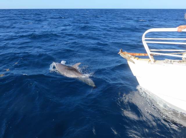 Là, là, là !… Et ce n’est pas une fausse alerte ! En même temps que Claire revenue à son poste de commande, un observateur plus attentif que les autres a repéré, juste devant notre étrave, un jaillissement d’écume, signe de la présence d’une petite compagnie de dauphins. Cédric, en marin expérimenté, grimpé sur le pont d’observation, confirme la bonne nouvelle. Alors, au risque que l’eau rentre par l’avant, tous, nous nous précipitons à la proue du petit navire pour admirer les évolutions de nos amis. Ce sont de grands dauphins à dos sombre qui nous accompagnent en un grandiose ballet de nage acrobatique et de petits sauts joyeux, juste pour nous saluer et montrer leur étonnant savoir-faire. Durant près d’une demi-heure et par deux fois, ces splendides animaux nous offrent le privilège de leur présence et de leurs facéties. Notre expédition est sauvée, nous savons d’ores et déjà que nous ne rentrerons ni bredouilles ni frustrés.