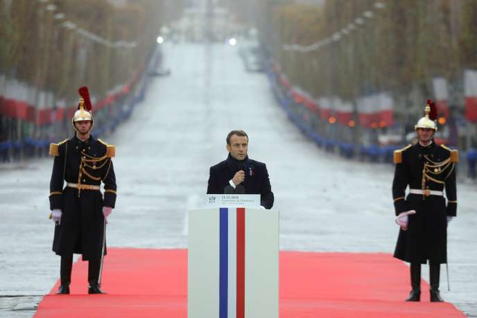 French President Emmanuel Macron delivers a speech during a ceremony at the Arc de Triomphe in Paris as part of the commemorations marking the 100th anniversary of the 11 November 1918 armistice, ending World War I, Sunday, Nov. 11, 2018. (Ludovic Marin/Pool Photo via AP)