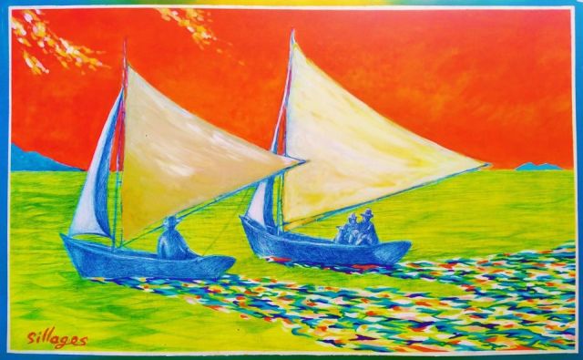 Ils sont trois hommes à bord. Pour un canot de sept mètres c’est un bel équipage. L’un accroupi sur ses talons nus, le chapeau rabattu sur le nez pour atténuer la réverbération, la barre et l’écoute en main. Jamais il n’amarre l’écoute. Le bateau est trop chatouilleux. Un second écope sans arrêt ce que le canot embarque d’eau au vent et à contre-bord. Le troisième est un acrobate. Assis sur la lisse, le derrière au-dessus de l’eau, se tenant d’une main par un bout de filin au mât, c’est lui qui d’un geste héroïque signale l’approche de la mauvaise vague au barreur. Il pousse un cri d’alarme en même temps.