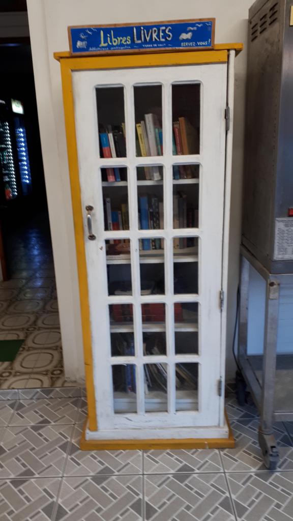 Malheureusement, non content de provoquer la mort, de saccager le paysage et les cultures, de détruire maisons particulières et édifices communaux, Maria a emporté le toit de cette mini-bibliothèque, mettant hors d’usage par ses pluies diluviennes beaucoup des précieux ouvrages qui la constituaient. Si bien que depuis cette date du 19 septembre 2017, Terre-de-Haut est privée de Bibliothèque. Et les amoureux de la lecture et du livre, frustrés de leur passe-temps favori qu’ils estiment indispensable à leur équilibre mental et à leur accès à la culture, n’ont eu d’autre ressource que de recourir à la modeste boîte aux livres que l’épicerie VIVAL a accepté gracieusement d’héberger à l’abri des intempéries. (Merci Madame Cassin !)