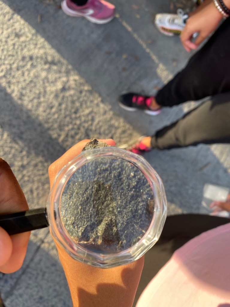 Les élèves ont pu prélever des échantillons à l’aide de leur marteau pour observer à l’oeil nu puis à la loupe les caractéristiques de leur échantillon (présence de plagioclases, pyroxènes) ( on peut se référer à la notice de la carte géologique pour plus de détails).