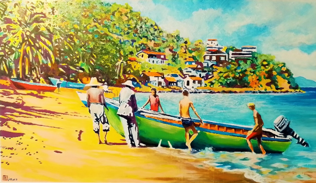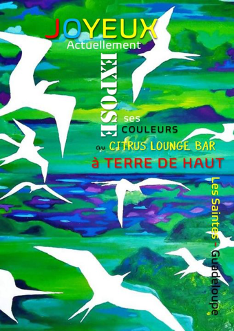 Alain Joyeux, artiste peintre, présente ses créations dans un nouvel espace d’exposition à Terre-de-Haut, archipel des Saintes en Guadeloupe. Connu et apprécié aux Saintes pour ses représentations très hautes en couleurs de la vie insulaire, Alain propose cette exposition-rétrospective en rendant visibles  des  créations originales de styles souvent très divers qui se côtoient et parfois se combinent. En différents formats, sur toiles, panneaux de bois, papiers, cette présentation privilégie l’acrylique comme médium principal et le bleu comme tonalité dominante.