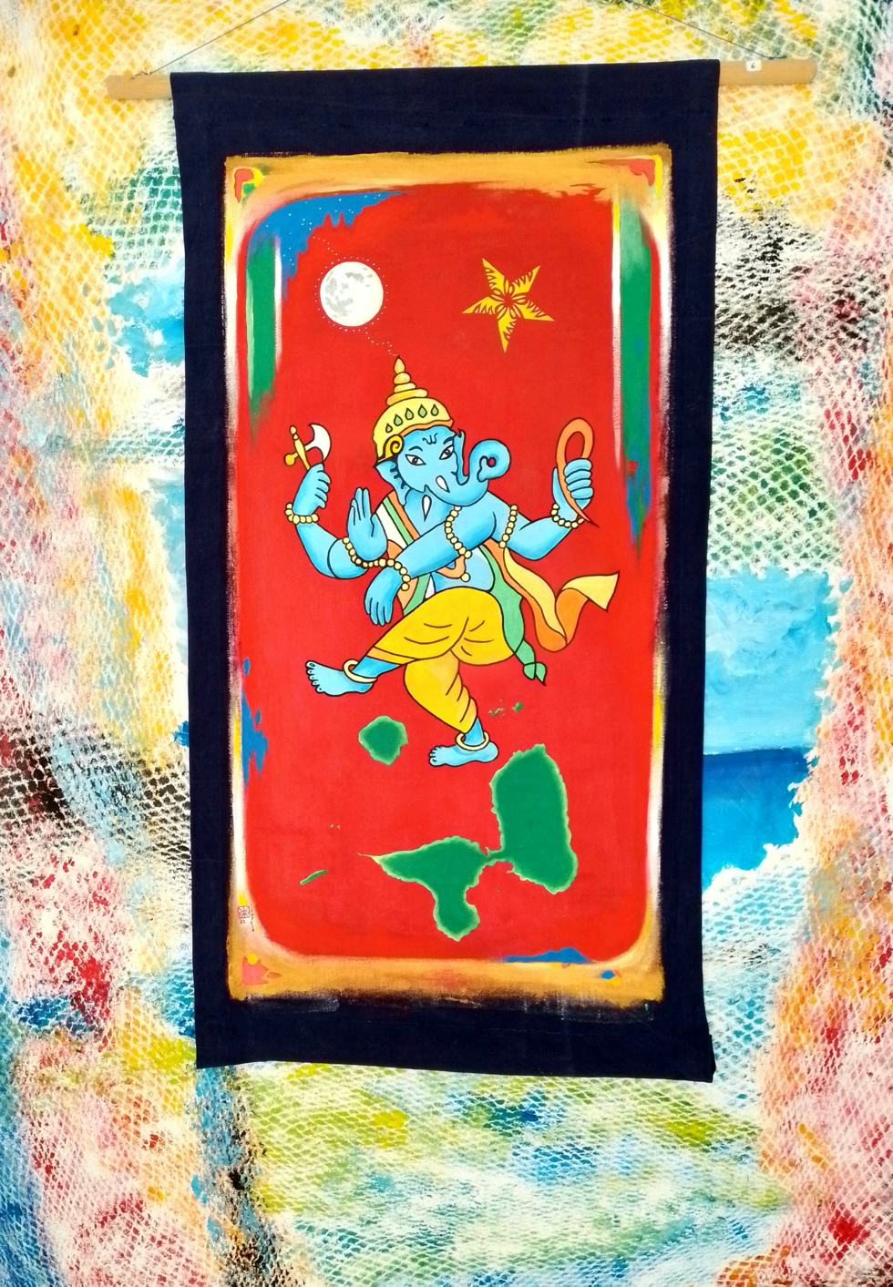 Les œuvres rassemblées et exposées actuellement ( une trentaine de pièces originales) présentent une rétrospective de tableaux et de « bannières » peintes ainsi que, pour la gourmandise, quelques « mini-art-dises » comme j’aime à les nommer  : des petits formats à vocation plutôt décorative appréciées des voyageurs notamment par leur format réduit.
