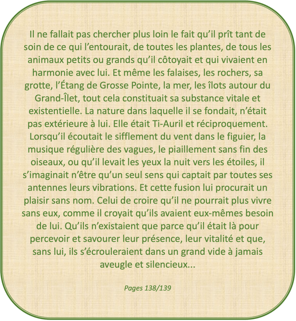 Sous les traits à peine voilés de Ti-Auril, on devine le jeune Raymond nous racontant son enfance de liberté absolue dans les mornes de Terre-de-Haut, sa communion enivrante avec la flore, la faune, les poissons, les rochers, les falaises, les senteurs, le chant du vent, la mer, auxquels il s’identifie ; le ciel, la nuit étoilée, le cosmos, à l’écoute des vibrations de l’univers. Il nous fait partager son émerveillement et comme d’habitude sa connaissance, d’une érudition rare, des noms de chaque plante, chaque arbre, chaque oiseau, en créole comme en français, d’autant plus précieuse que beaucoup de ces espèces ont aujourd’hui disparu sous le béton ou le bitume.
