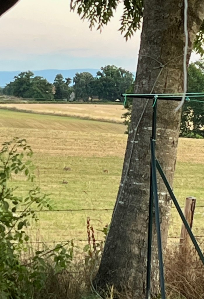 11h, à Marcigny, achat de 10 pieds de salades à repiquer. Nous déjeunons à l’intérieur, délogés par la chaleur. Mais le soir retour au deck, avec 3 lièvres gambadant en face dans le pré voisin.