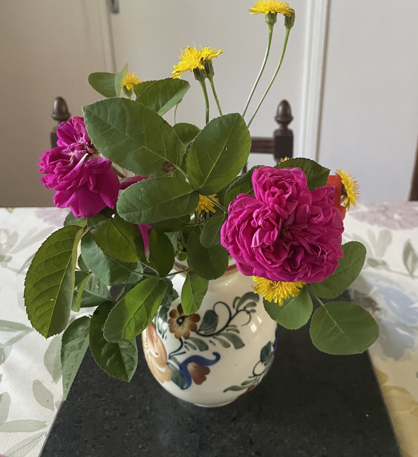 Lever tardif : pour une fois 9h 30… avec toujours beau soleil au rendez-vous.. Bouquet de roses et boutons d’or. Je cueille une nouvelle courgette et rafraîchis les pieds à l’arrosoir. Pour le potager, ce sera à la tombée de la nuit ou du jour, c’est selon…