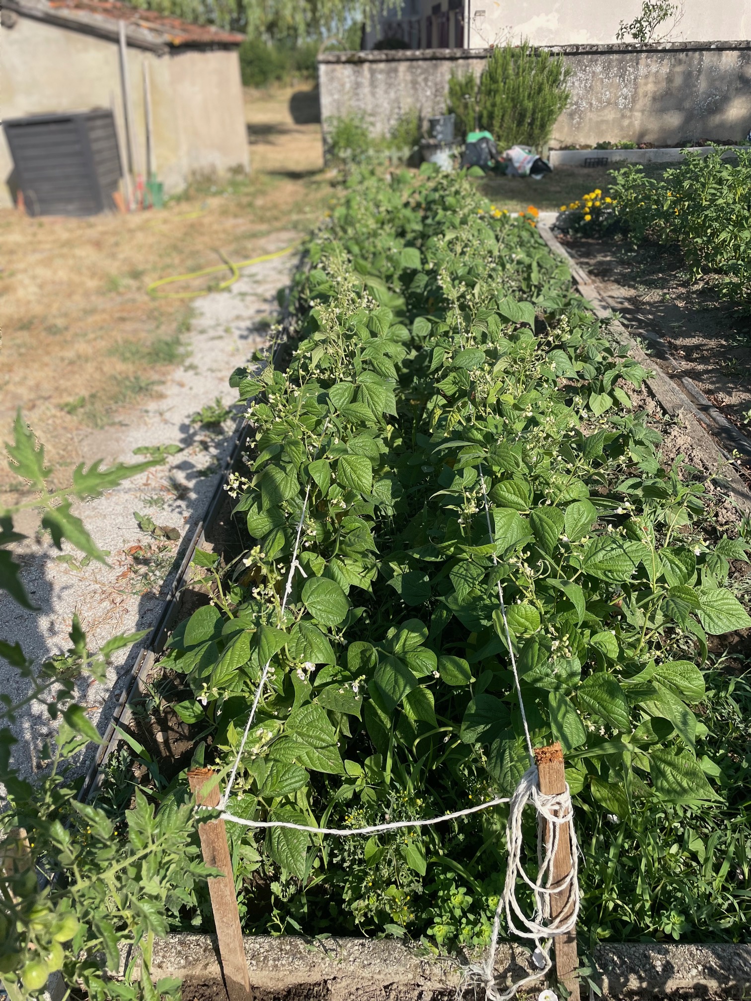 Repas midi à l’intérieur. Miracle au potager : les premiers minuscules haricots émergent de leurs fleurs. Semés le 15 mai, soit 43 jours de gestation…