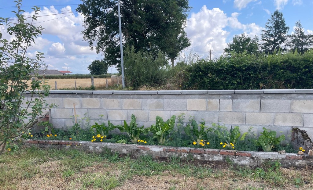10h, suite débroussaillage coté appentis. Je déplace les poteaux téléphoniques au sol pour délimiter une nouvelle parcelle à bêcher pour l’an prochain ! En attendant, nous montons le parasol à une nouvelle place. L’ombre englobe désormais tout le SPA.