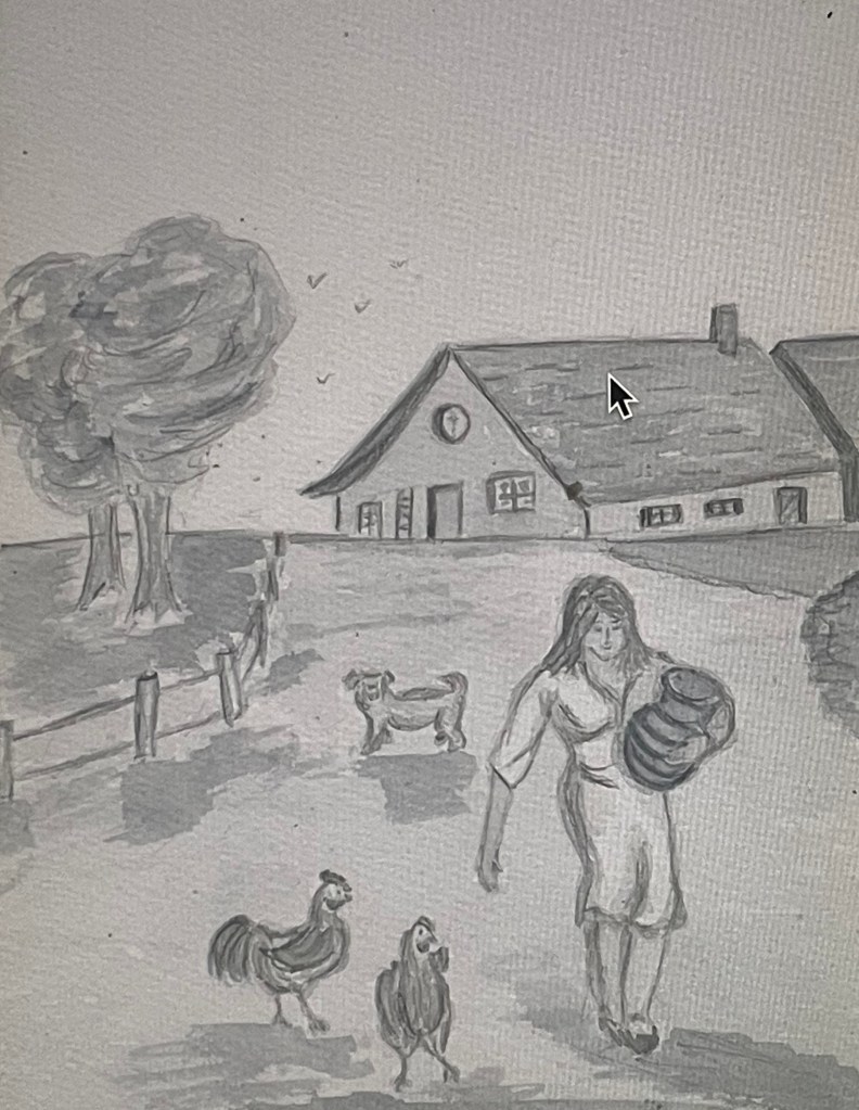 Inquiète, elle s’arrêta pour réfléchir et commençait à se décourager quand elle aperçut dans le lointain, flottant dans l’air gris comme des papillons sans couleur, le toit et la cheminée de quelques maisons. Cela lui redonna du courage et elle se remit à marcher. Mais pas pour longtemps car avant d’atteindre la première maison, elle s’évanouit de fatigue et tomba doucement dans l’herbe grise comme une poupée de chiffon désarticulée.