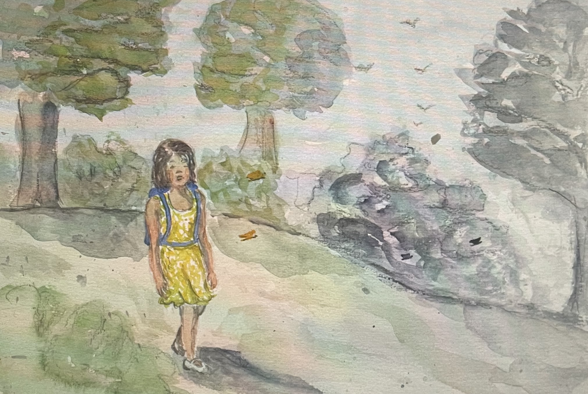 Ce qui la chagrinait aussi c’était qu’au fur et à mesure qu’elle avançait, elle se rendait compte que quelque chose changeait autour d’elle. Ce matin-là, alors que le soleil était déjà bien levé, elle fut surprise de ne plus distinguer ni le bleu du ciel, ni le vert des prairies et des feuilles, ni les belles couleurs de ses habits et de son sac. C’était comme si un voile de poussière grise avait enveloppé le paysage et tout ce qu’il contenait.