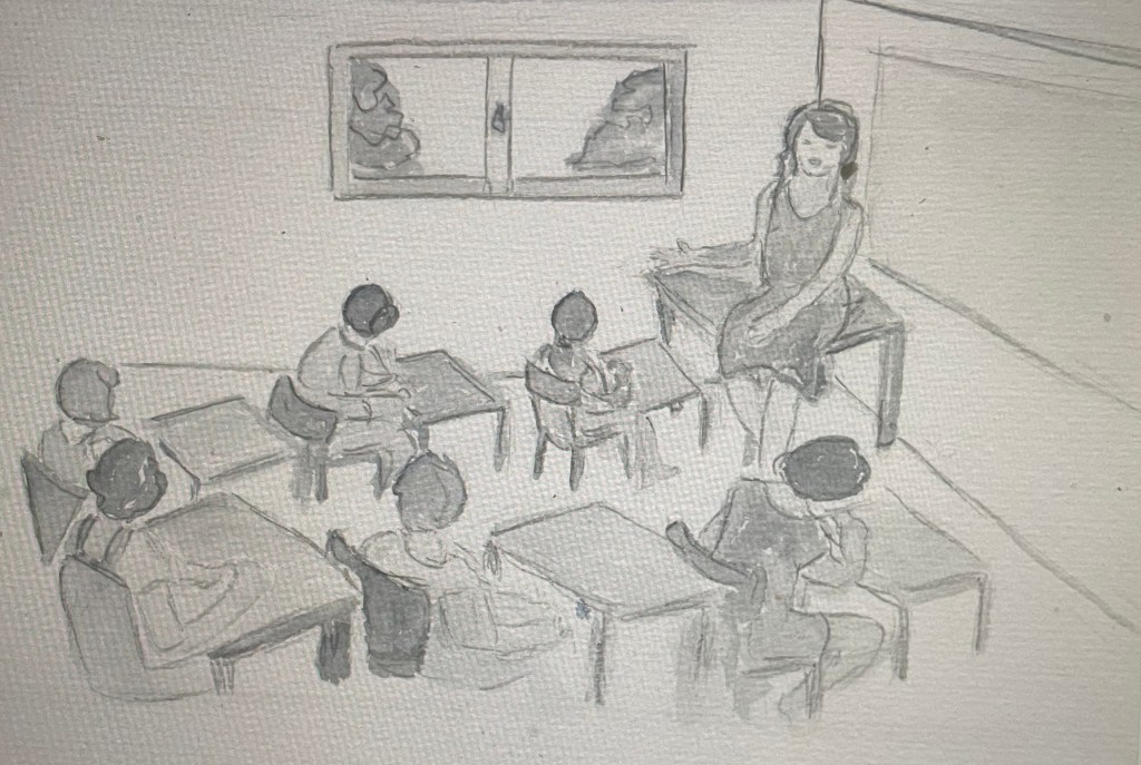 Après quelques heures d’un repos bien mérité et un bon déjeuner, on la conduisit dans une pièce qui ressemblait à une salle de classe.