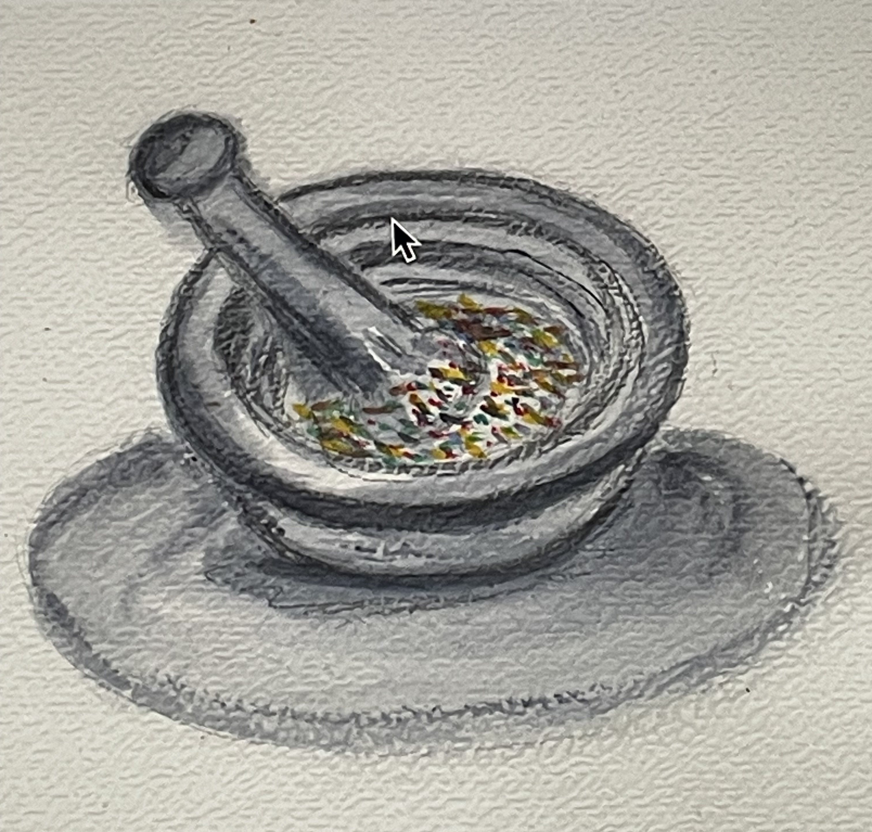 Pendant ce temps, la petite fille, qui elle aussi avait retrouvé “ses” couleurs, sortit de la pièce et alla récupérer ses crayons. Elle observa que c’était seulement dans la salle et sur la terrasse où les mines des crayons s’étaient légèrement touchées que le miracle s’était produit.