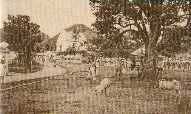 Elles déversent une multitude de petits matelots tous pareils, vêtus de toile blanche et du célèbre col bleu, dont le soleil a teint les visages en rouge brique. Certains s’engouffrent dans les débits. Beaucoup gagnent les plages pour se baigner, ou bien, munis d’un Kodak ils escaladent les mornes en « touristes ».