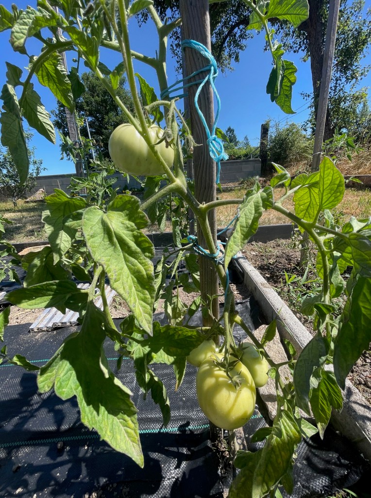 10h : travail au potager : je m’occupe des poirées-blettes et vérifie l’attache des tomates. Désherbage poireaux et carottes côté courgettes. Installation supports pour les courges + arrosage. La petite pluie d’hier soir n’était que superficielle. À peine plus qu’un pipi de moineau. Désherbage des tomates. Très belle journée d’été, nous déjeunons et dînons sur le deck. Il a fait grand soleil du lever au coucher, sans vent. Temps hyper calme. Nous nous ébouillantons dans le SPA à 32°.