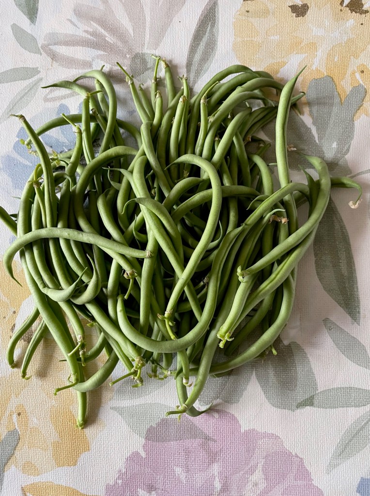 10h, suite débroussaillage coté appentis. Je déplace les poteaux téléphoniques au sol pour délimiter une nouvelle parcelle à bêcher pour l’an prochain ! En attendant, nous montons le parasol à une nouvelle place. L’ombre englobe désormais tout le SPA. Repas midi à l’intérieur. Miracle au potager : les premiers minuscules haricots émergent de leurs fleurs. Semés le 15 mai, soit 43 jours de gestation… Après-midi : je continue mon travail de débroussaillage côté bouchure Deverchère-Naulin.