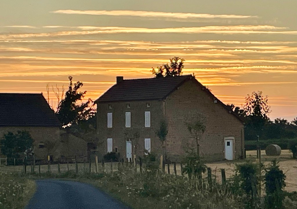 Grand soleil. J’en profite pour commencer à débroussailler la parcelle derrière les petits bâtiments. Fil coupé à plusieurs reprises. J’installe la lame qui fauche à ras du sol chiendents et orties mais sans déchiqueter l’herbe. Donc passage au fil obligatoire après cette première coupe. Et ratissage pour rassembler le foin… 19h, premier bain au SPA. L’eau est à 26 degrés, un peu trop fraîche pour certains et premier vrai repas sur le deck depuis notre arrivée. Pas un insecte importun autour de la table. Sans doute abasourdies par la canicule, les guêpes préfèrent la clim de leur refuge alvéolé. Beau ciel coloré à l’ouest.