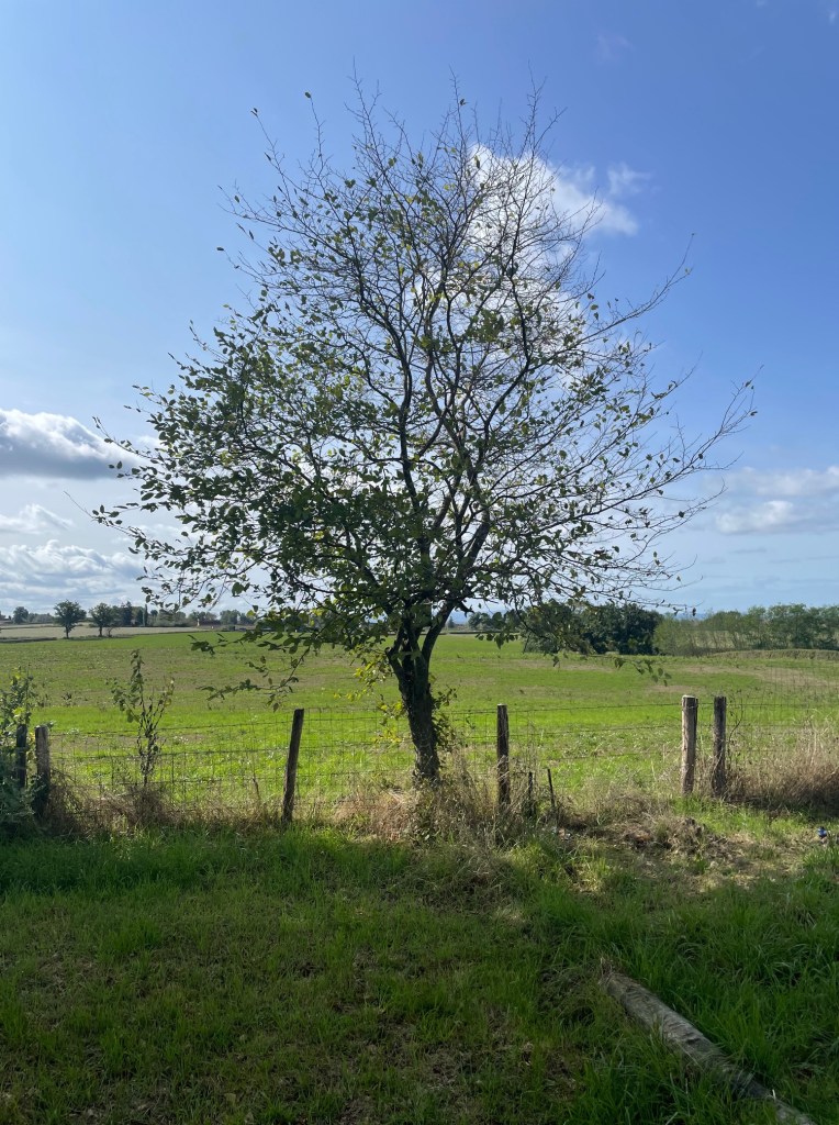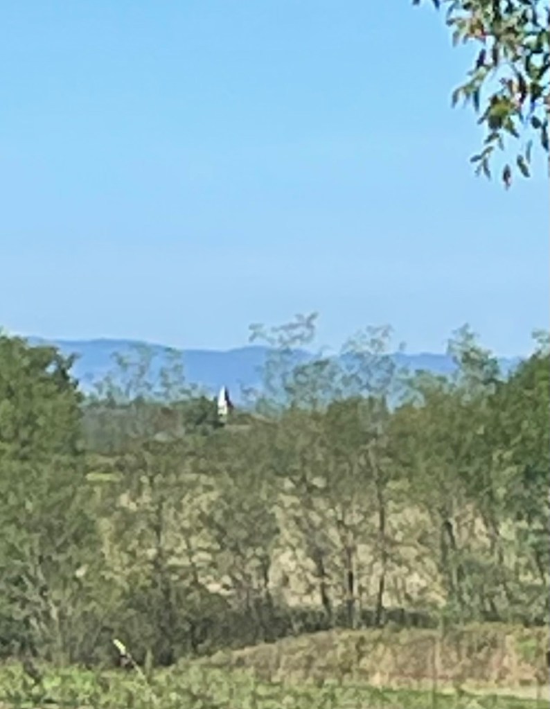 Beau présage : 8 h, le soleil, plein Est, s’infiltre sous la porte de la chambre d’Alex. Ciel parfaitement dégagé au réveil. Température extérieure 14 degrés. Le thermomètre indique qu’elle serait descendue à 8 cette nuit. Et nous ne sommes pas encore en automne. Dans l’axe de l’entrée de l’ancienne étable, je photographie le clocher de l’église, bien visible à travers la haie de frênes déjà à demi dépouillés de leurs feuilles. Même image à l’étage depuis la fenêtre de la chambre.
