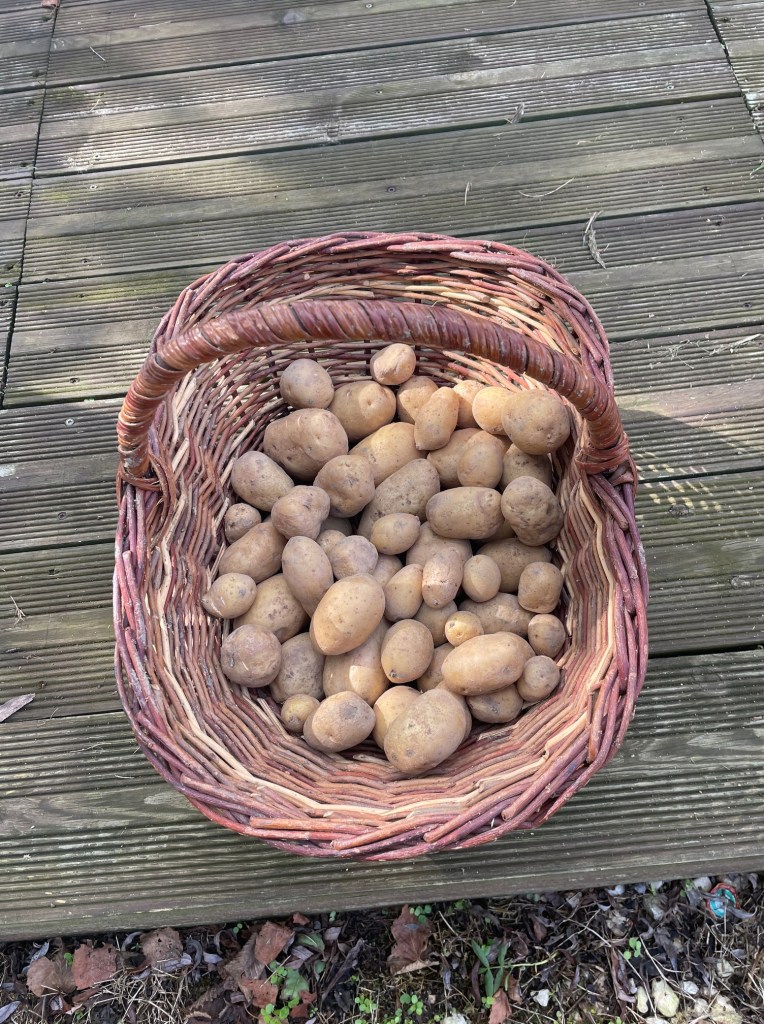 Entre 11h et midi, sous une forêt d’herbes, de celles dont l’extrémité de la tige s’accroche à vos basques comme du stratch et vous fait pester, à l’aide de ma bêche plate, je déterre les patates, facilité par la souplesse de la terre. À peine un fond de panier d’osier de cette maigre récolte de tubercules de Parmentier, dont certains attaqués par le ver blanc présentent des cavités qui font penser à de petits cratères de volcans éteints.